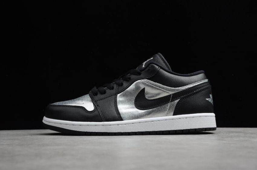 This offering of the Air Jordan 1 Low features a Silver crinkled leather on the toe box and side panel paired with Black smooth leather overlays. Black mesh tongues, matching colored laces, Silver embroidered Jumpman tongues, insoles, and Wings heel logos atop a White midsole and Black rubber outsole completes the design.