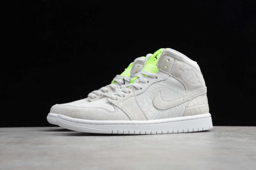 Dressed in a Vast Grey, Ghost Green, and White color scheme. This mid-top Air Jordan 1 features a mix of premium materials including mesh, suede, smooth leather and faux croc all done in its Grey hue. 3M reflective detailing covers the woodgrain-like finish on the side panels and toe, while having a vibrant Green tongue completed with velcro tongue tags. Black detailing, a Swoosh lace dubrae atop a White rubber sole completes the design.