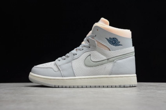 Dressed in a Photon Dust, Light Smoke Grey, and Grey fog color scheme. This Air Jordan 1 Zoom Comfort comes constructed in mix of tumbled and smooth leather with mesh appearing on the cut-out Swooshes, padded ankle collar and tongues. Zoom Air branding tongues and insoles with a debossed leather LDN hangtag completes the design.